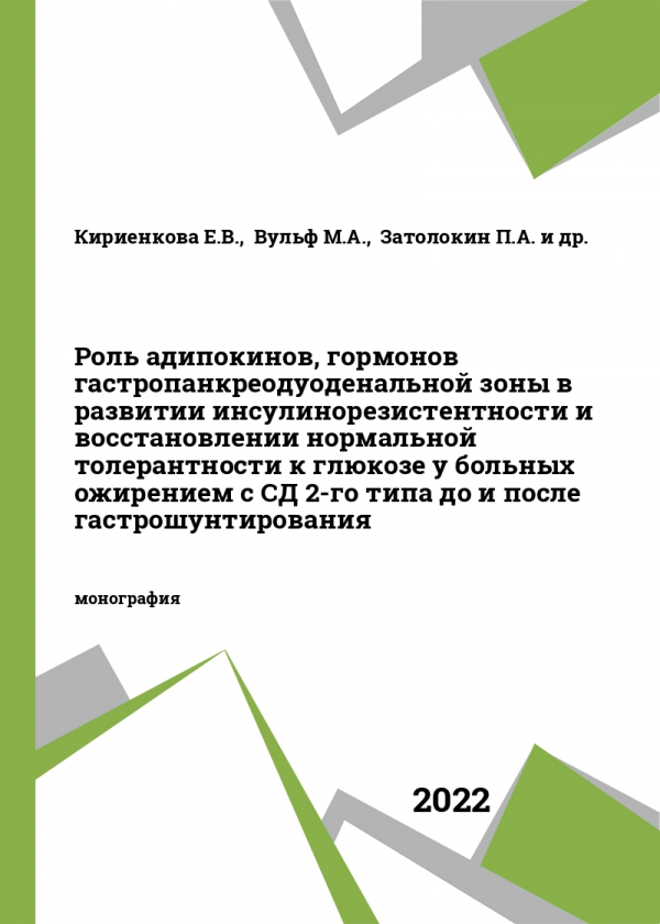 Роль адипокинов, гормонов гастропанкреодуоденальной зоны в развитии инсулинорезистентности и восстановлении нормальной толерантности к глюкозе у больных ожирением с СД 2-го типа до и после гастрошунтирования : монография / Кириенкова Е. В., Вульф М. А., Затолокин П. А. [и др.] ; ред. Литвиновой Л. С. - Балтийский федеральный университет им. Иммануила Канта, 2022. - ISBN 978-5-9971-0721-5 .