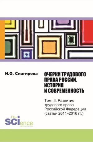 Снигирева, И. О., Очерки трудового права России. История и современность.Том 3 : сборник статей / И. О. Снигирева, ; под ред. И. О. Снигиревой, Коллектив авторов. — Москва : Русайнс, 2016. — 298 с. — ISBN 978-5-4365-0874-0.
