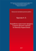 Разработка туристского продукта в рамках детского туризма по Южному Подмосковью : студенческая научная работа / А. О. Брусова ; Российская международная академия туризма, Факультет менеджмента туризма, Кафедра туроперейтинга. - Москва, 2017. -164 с.