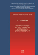 Индивидуализация как фактор развития детей младшего школьного возраста : студенческая научная работа / А. С. Травникова ; Тюменский государственный университет, Ишимский педагогический институт им. П. П. Ершова (филиал) ТюмГУ, Кафедра теории и методики начального и дошкольного образования. - Ишим : б. и., 2022. -