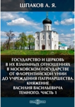 Государство и церковь в их взаимных отношениях в Московском государстве от Флорентийской унии до учреждения патриаршества. Княжение Василия Васильевича Темного / А. Я. Шпаков. - Киев : Типография Императорского Университета св. Владимира. Акционерного общества печати и издательского дела Н. Т. Корчак-Новицкого, 1904. -300 с.
