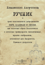 Блаженного Августина Ручник о трех евангельских добродетелях: вере, надежде и любви: где истинный образ богопочтения, и истинная премудрость человеческая кратко изображены, сочиненной для Лаврентия, римского дворянина / Августин Аврелий. - Санкт-Петербург : Печатано у Шнора, 1787. -