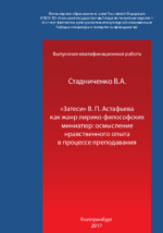 «Затеси» В. П. Астафьева как жанр лирико-философских миниатюр: осмысление нравственного опыта в процессе преподавания : магистерская диссертация : студенческая научная работа / В. А. Стадниченко ; Уральский государственный педагогический университет, Институт филологии, культурологи и межкультурной коммуникации, Кафедра литературы и методики её преподавания. - Екатеринбург, 2017. -